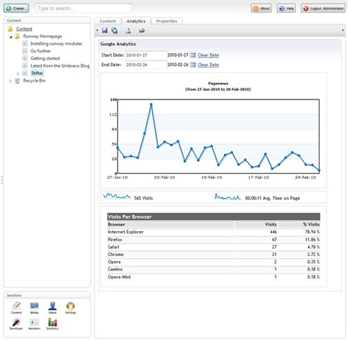 Dieses Package erweitert das Backend um eine neue Section, mit der Sie aus Umbraco heraus direkten Zugang zu Ihren Google Analytics Statistiken in Form von einigen Standardreports bekommen. Sie haben ausserdem die Möglichkeit, benutzerdefinierte Reports über die Google Analytics API zu generieren.