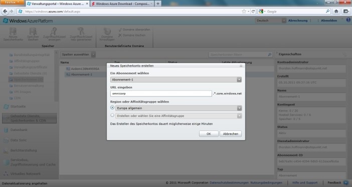 Im sich öffnenden Dialog legen wir eine URL für das Speicherkonto fest (omnicorp) und können die Region auswählen, wo unser Storage erstellt werden soll (Europa allgemein).