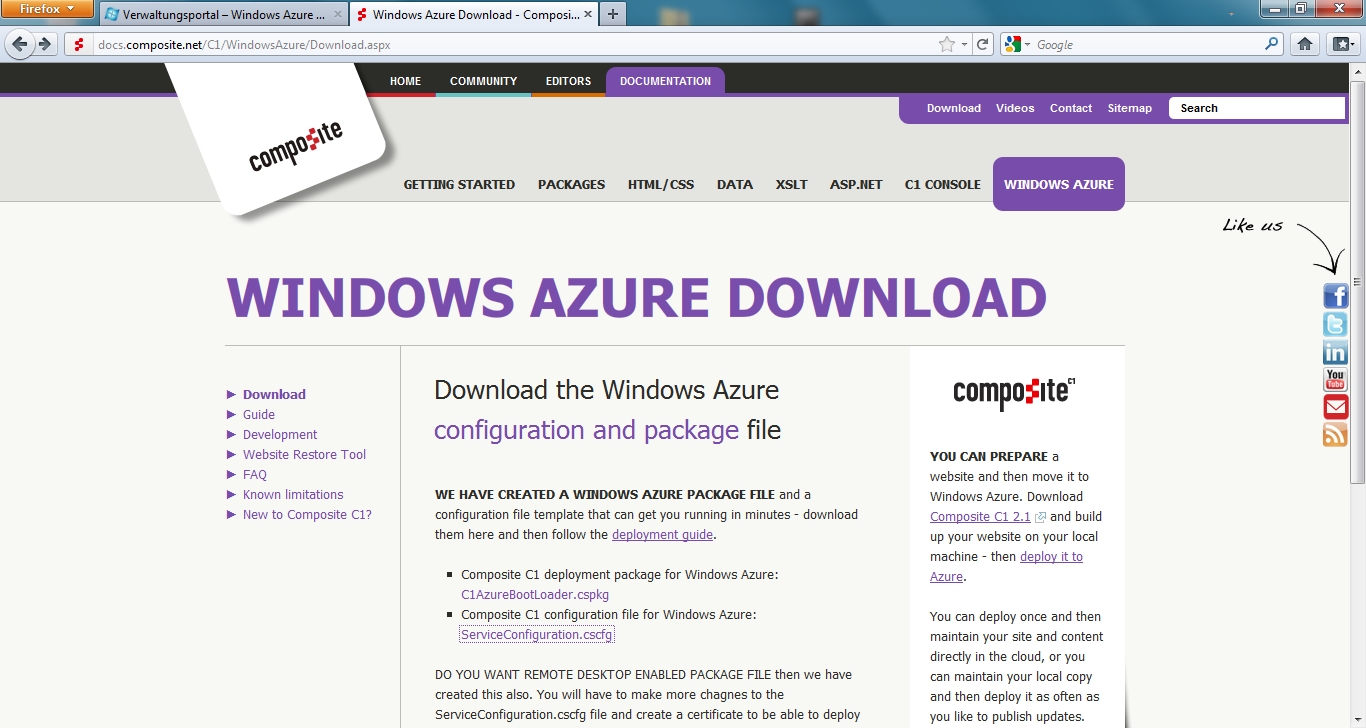Als nächstes laden wir uns das Composite Azure Package- und Konfigurationsfile auf http://docs.composite.net/C1/WindowsAzure/Download.aspx herunter: