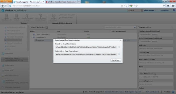 Den Zugriffsschlüssel können wir uns im Azure Management Portal anzeigen lassen und in die Zwischenablage kopieren: