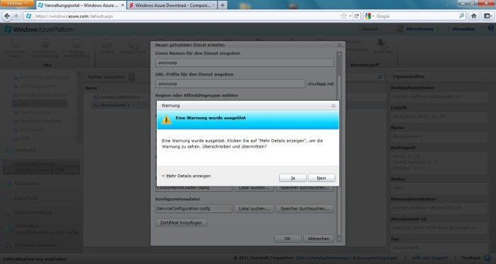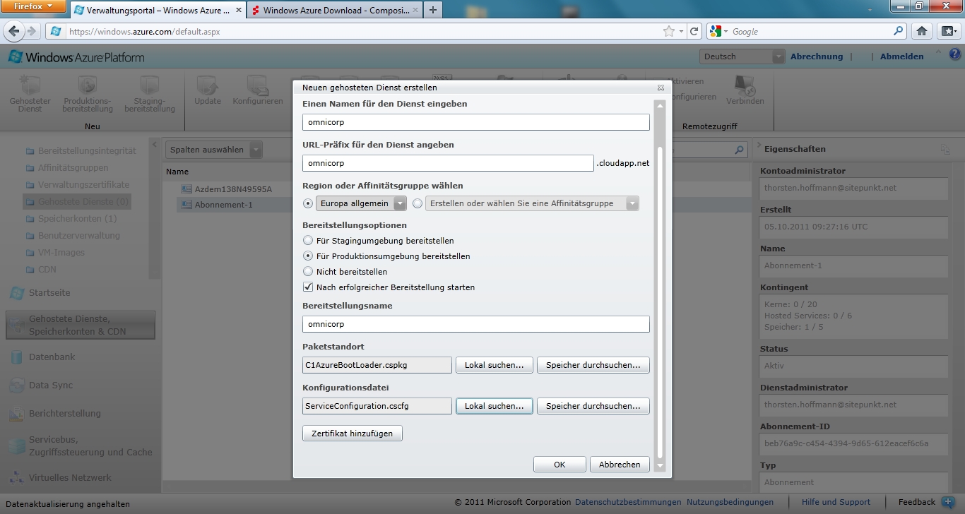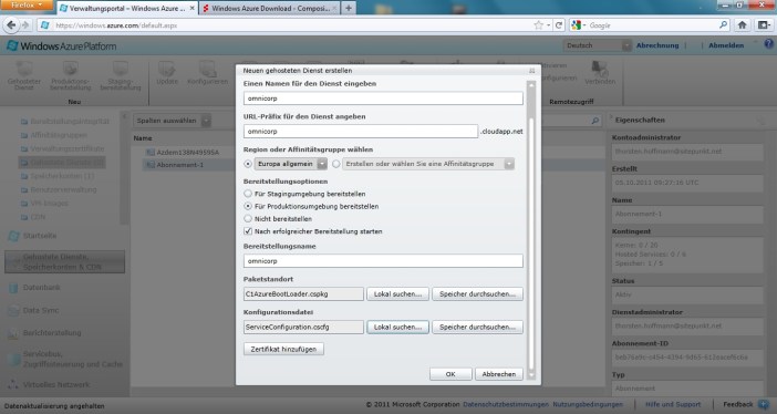 Im sich öffnenden Dialogfenster geben wir einen Dienstnamen an und definieren einen URL-Präfix, unter dem der Dienst später öffentlich erreichbar sein wird (omnicorp.cloudapp.net)