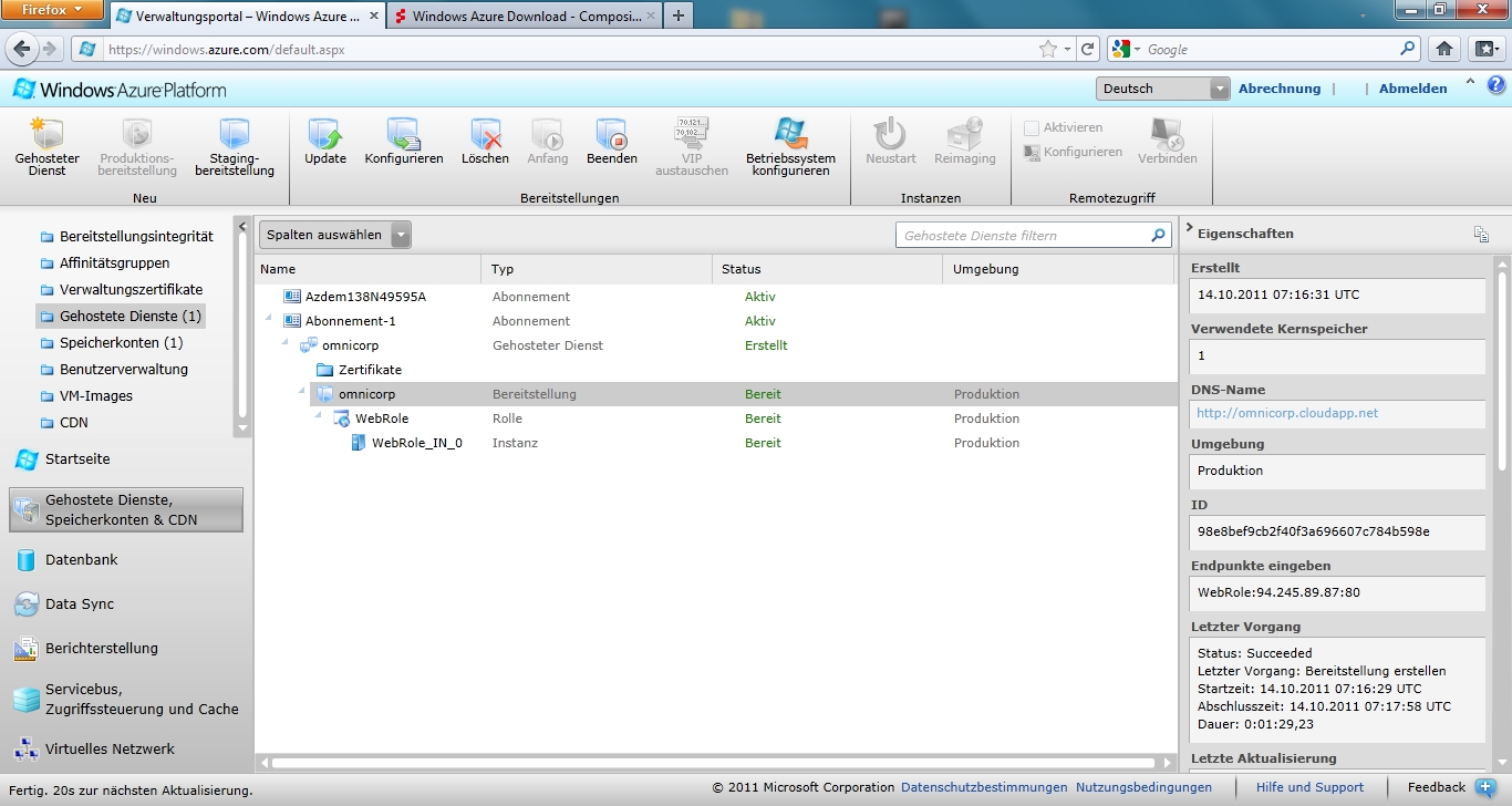 Sobald Bereitstellung, Rolle und Instanz im Management Portal mit einem grünen ‚Bereit‘ dargestellt werden, können wir auf unsere neue Website über den DNS-Namen der Bereitstellung http://omnicorp.cloudapp.net zugreifen: