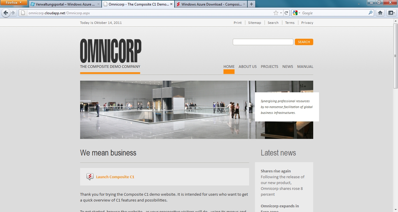 Sobald die CMS-Installation fertiggestellt ist, haben wir nun eine lauffähige C1 Demo-Website – powered by Windows Azure 🙂