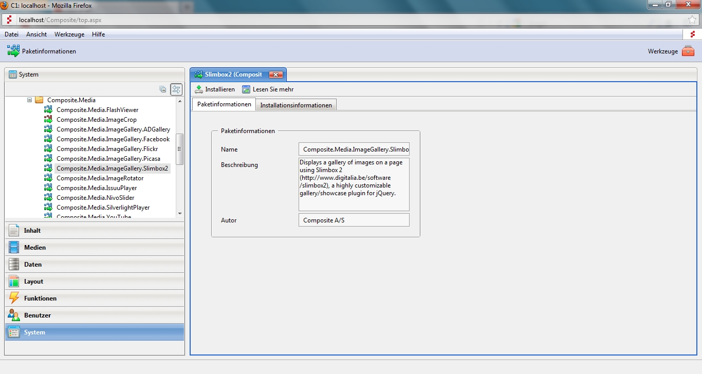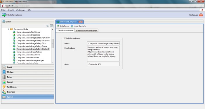 Wie beim Facebook-Package auch, installieren wir vorab das Slimbox-Package, welches die automatische Galeriedarstellung der Bilder auf unserer Website ermöglicht: