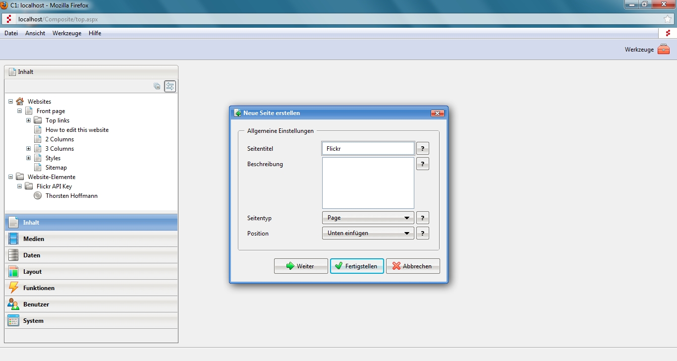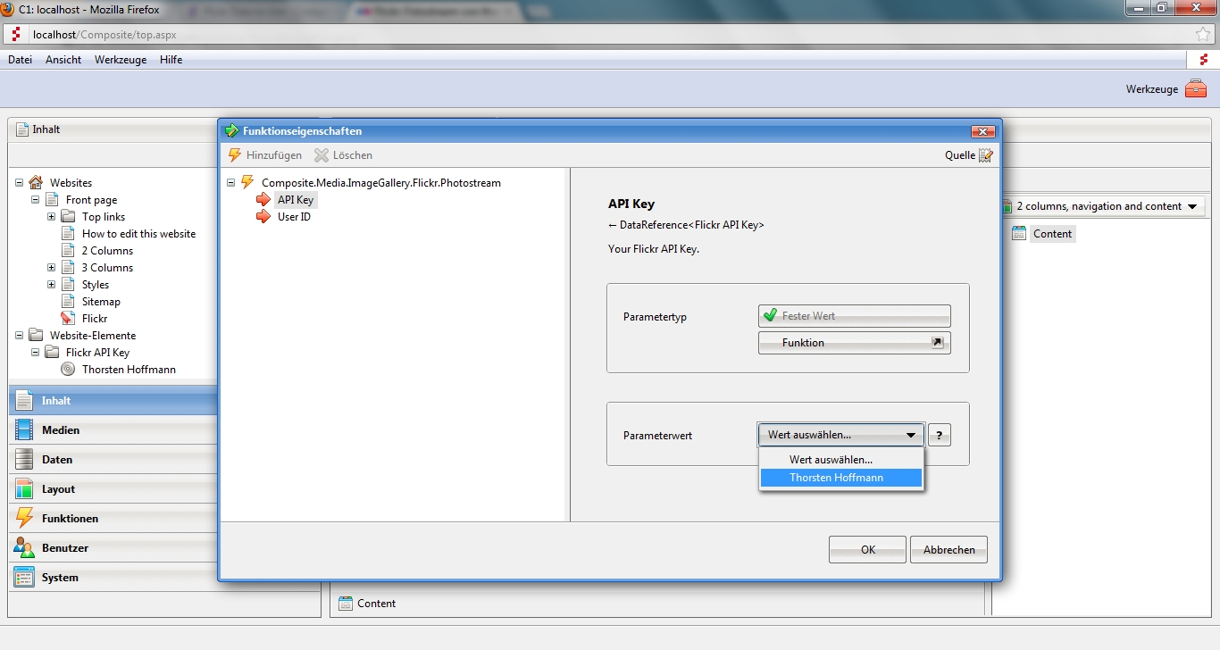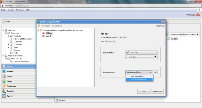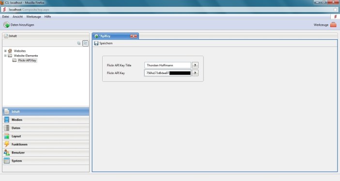 Für die Nutzung von Flickr ist ein sogenannter API Key notwendig, den wir im Bereich Inhalt / Website-Elemente mit einem Namen hinterlegen, um ihn später im Funktionsaufruf als Parameter nutzen zu können: