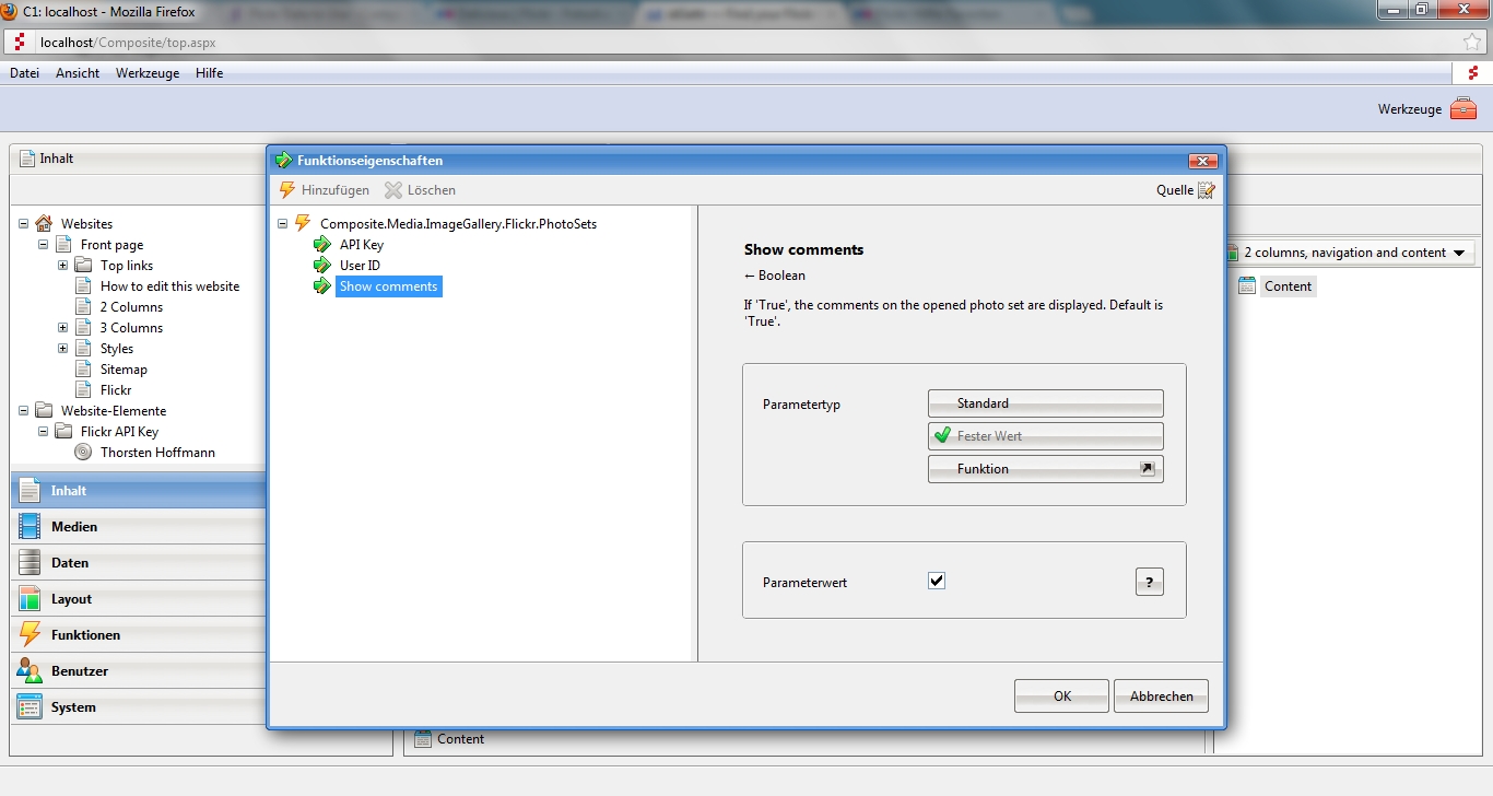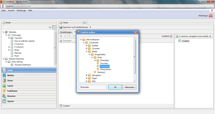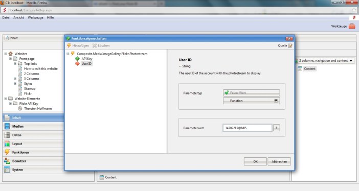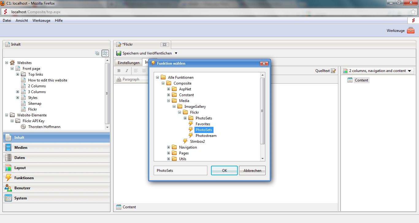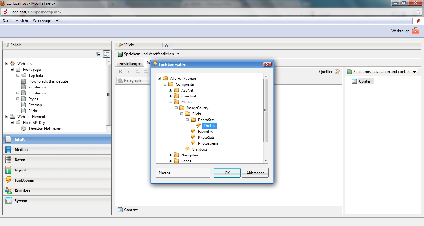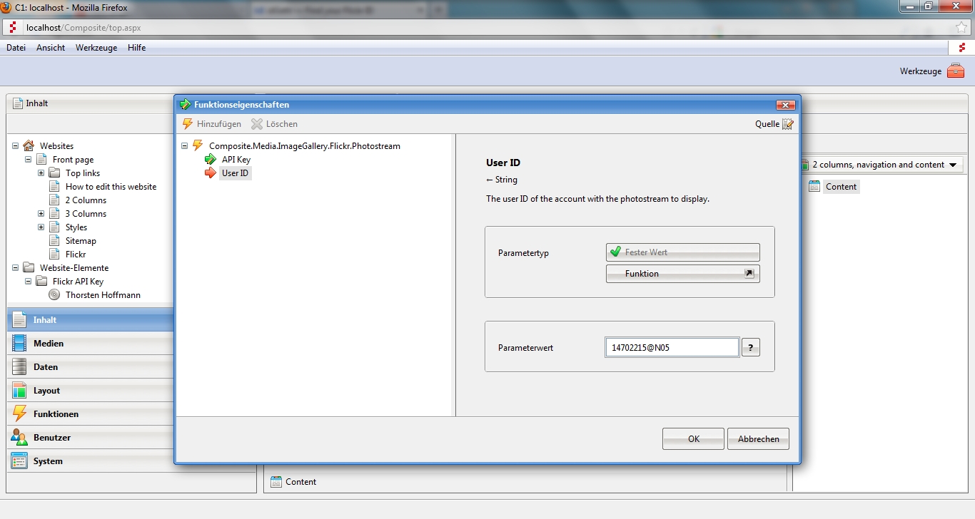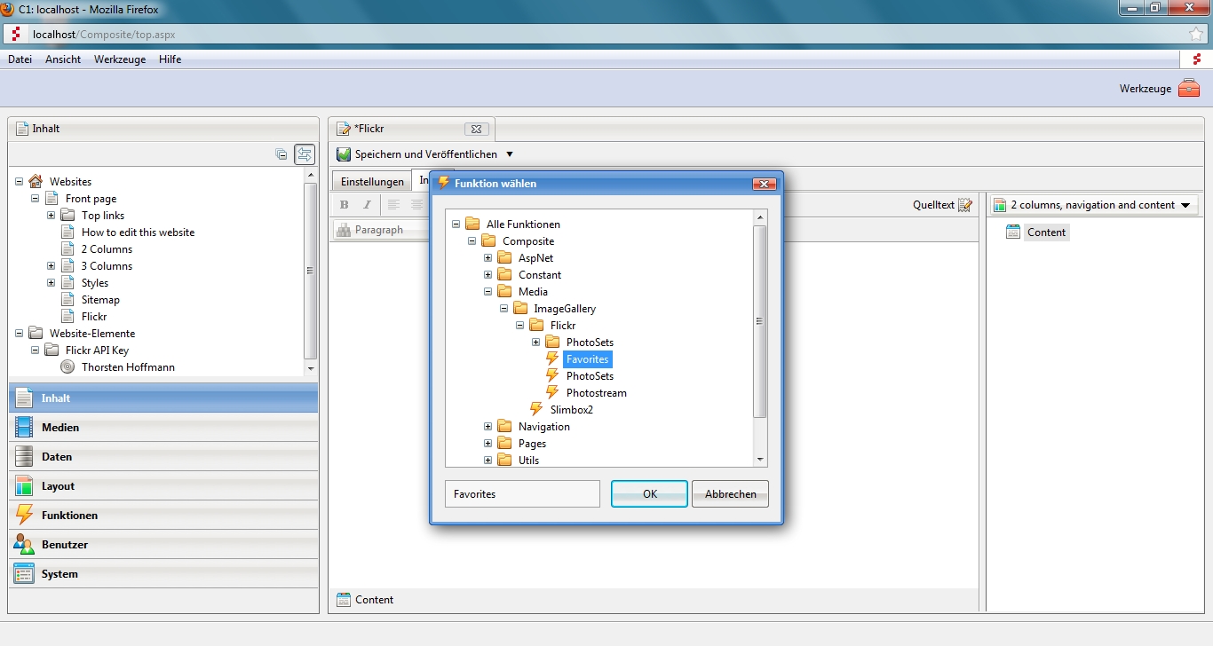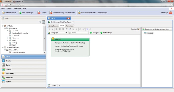 Wir fügen dazu die Funktion ‚Composite.Media.Flickr.Favorites‘ auf unserer Seite ein: