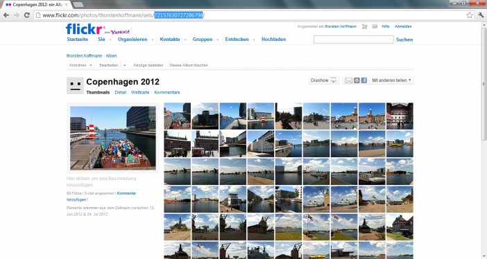 Zur Ermittlung dieser ID lassen wir uns in unserem Flickr-Account das entsprechende Album anzeigen und kopieren den letzten Teil der Album-URL in die Zwischenablage – dies ist die Set ID: