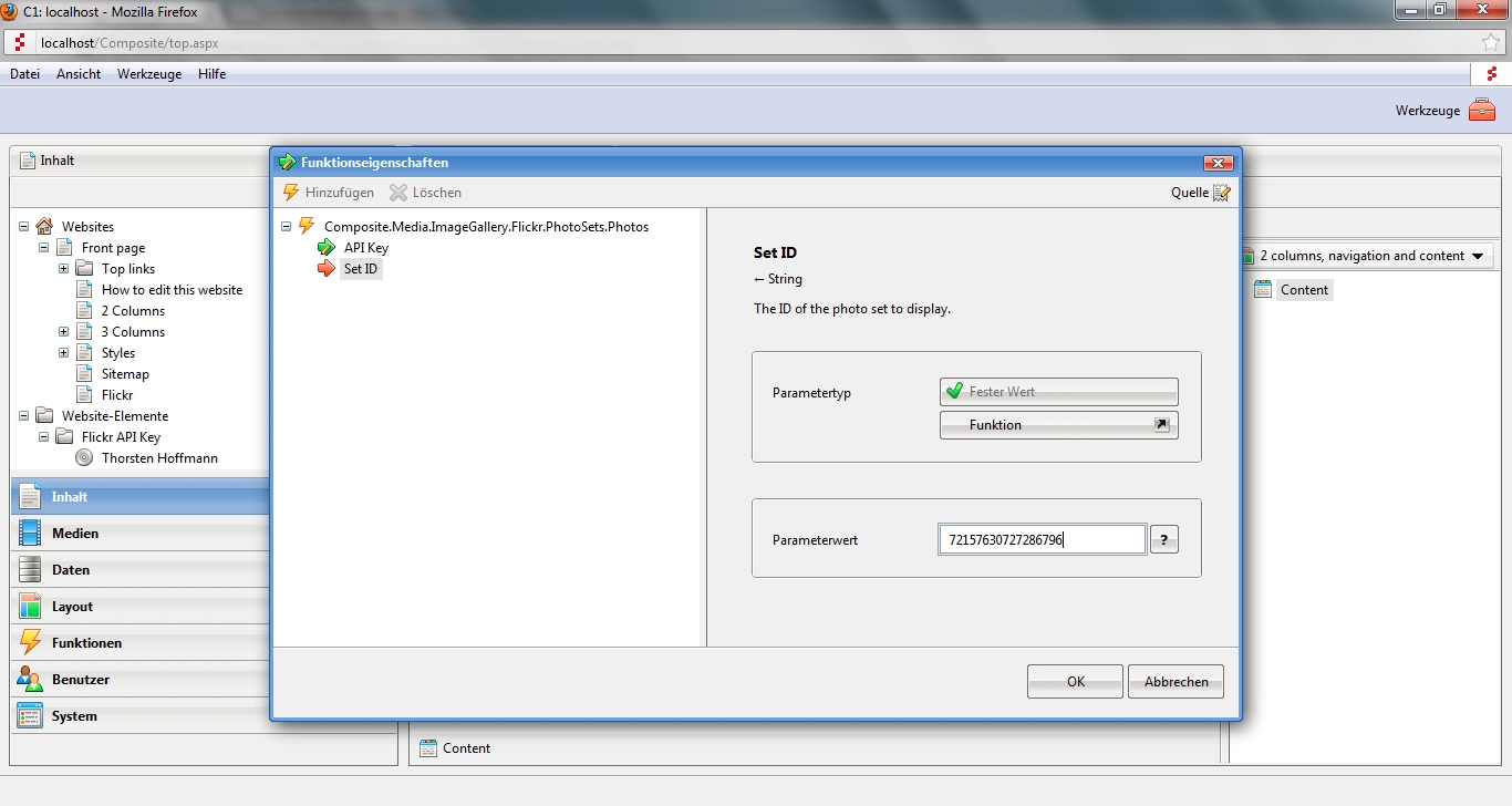 Bei Flickr können die Fotos in Alben organisiert werden. Um nun alle Alben eines bestimmten Nutzer darzustellen, fügen wir die Funktion ‚Composite.Media.Flickr.PhotoSets‘ auf unserer Seite ein: