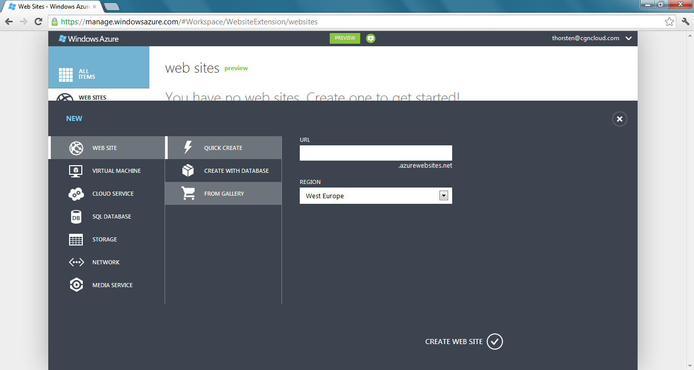 Zunächst loggen wir uns unter http://manage.windowsazure.com in das Preview-Portal ein, in dem wir die neuen Funktionen nutzen können.