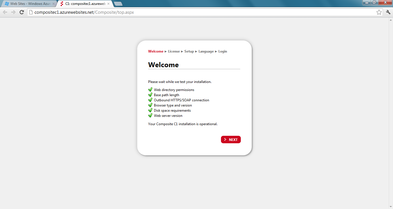 Nachdem wir die URL unserer neuen Website aufgerufen haben, können wir nun mit der Einrichtung von Composite C1 – wie in diesem Artikel beschrieben – beginnen: