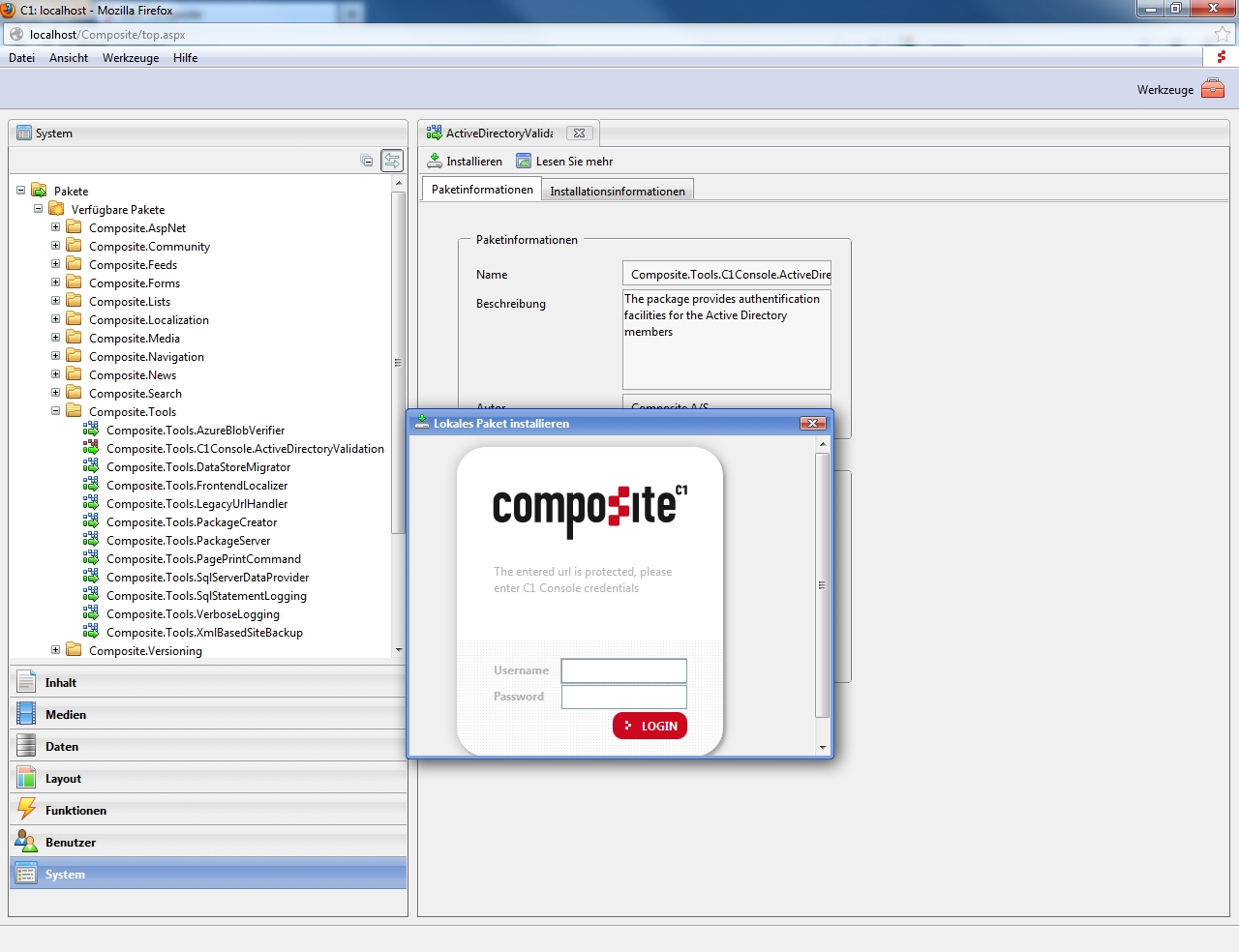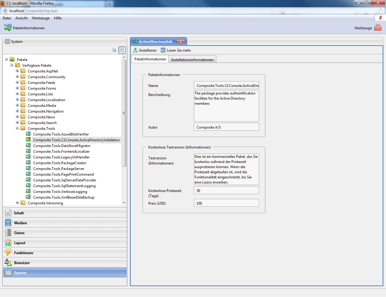 Als nächstes installieren wir unter ‚System‘ das kostenpflichte Package ‚Composite.Tools.C1Console.ActiveDirectoryValidation‚, welches wir in einem 30-tägigen Testzeitraum kostenlos nutzen können: