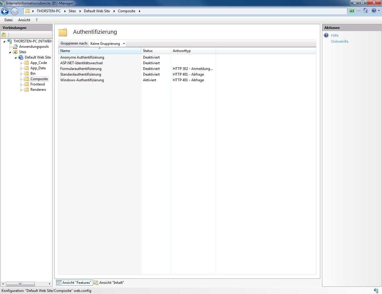 Im Ordner ‚Composite‘ öffnen wir den Punkt ‚Authentifizierung‘, aktivieren die ‚Windows-Authentifizierung‘ und deaktivieren alle anderen Authentifizierungsmechanismen: