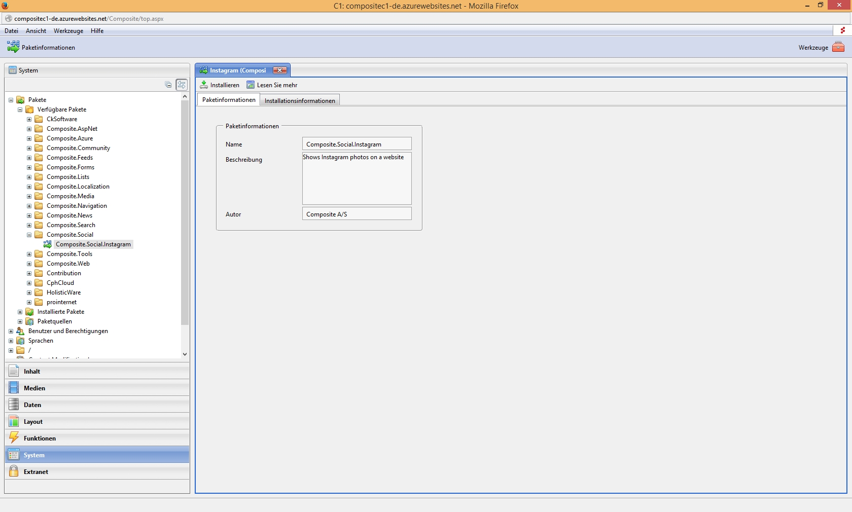 Das neue Package Composite.Social.Instagram lässt sich über den Bereich ‚System‘ / ‚Pakete‘ im Backend installieren: