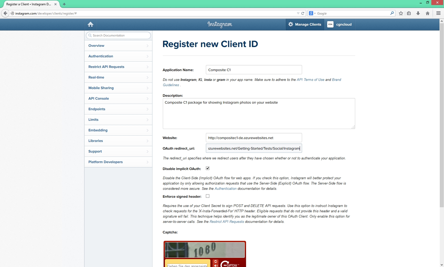 Anschließend kopieren wir die Client ID sowie das Client Secret unseres erstellen Clients, um diese Daten dann im C1 Backend unter Website-Elemente als neue Instagram-Konfiguration zu speichern: