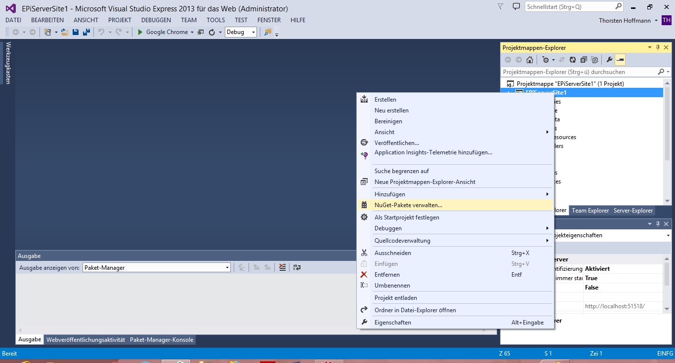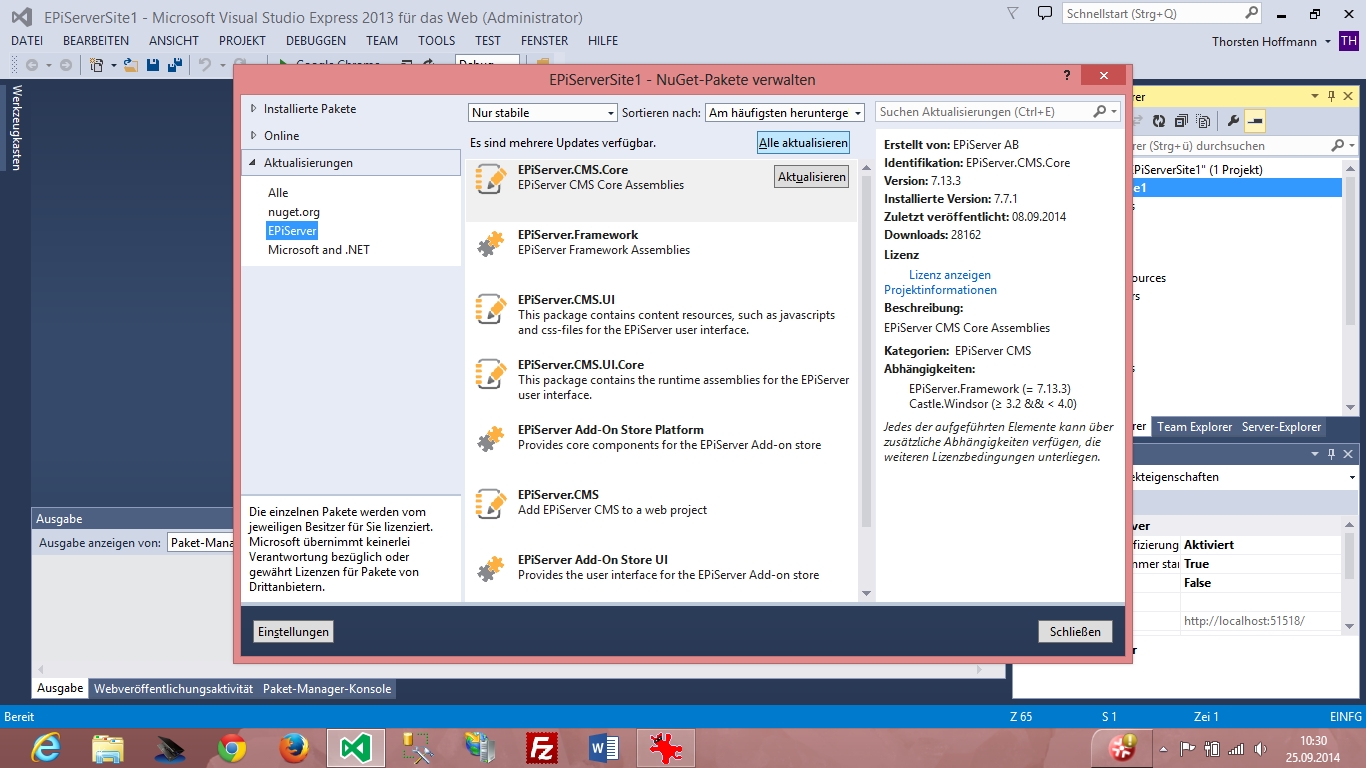 Nachdem das neue Projekt fertiggestellt wurde, installieren wir zunächst noch die aktuellen Updates für EPiServer CMS über den NuGet-Paketmanager: