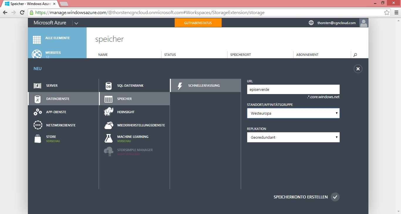 Zu diesem Zweck legen wir ein neues Speicherkonto über ‚Neu‘ -> ‚Datendienste‘ -> ‚Speicher‘ -> ‚Schnellerfassung‘ an: