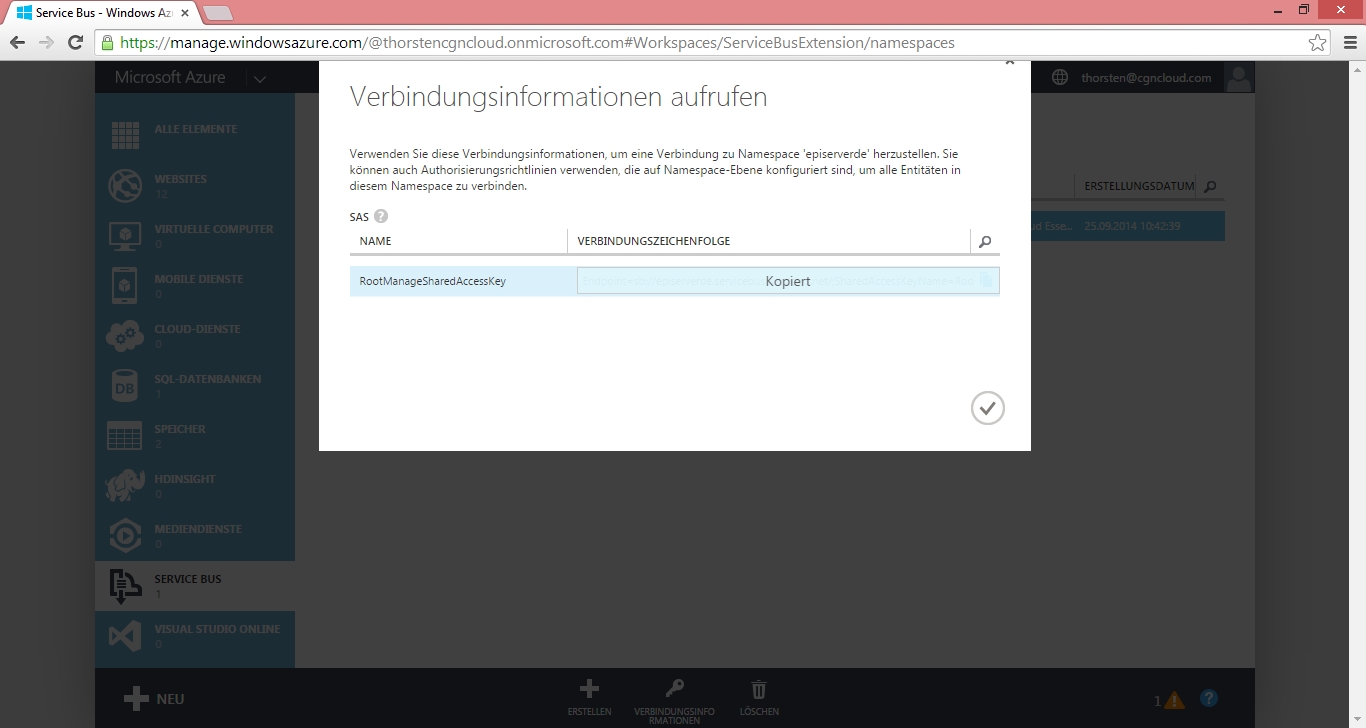 Die anzupassenden Verbindungszeichenfolgen können aus dem Azure Management Portal kopiert werden: