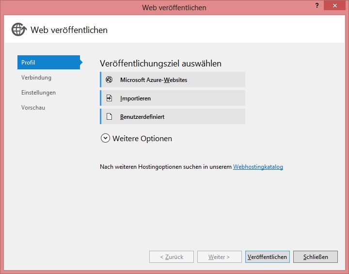 Wir klicken dazu im Kontextmenü unseres Projekt auf ‚Veröffentlichen‘ und Importieren die Veröffentlichungseinstellungen von Windows Azure: