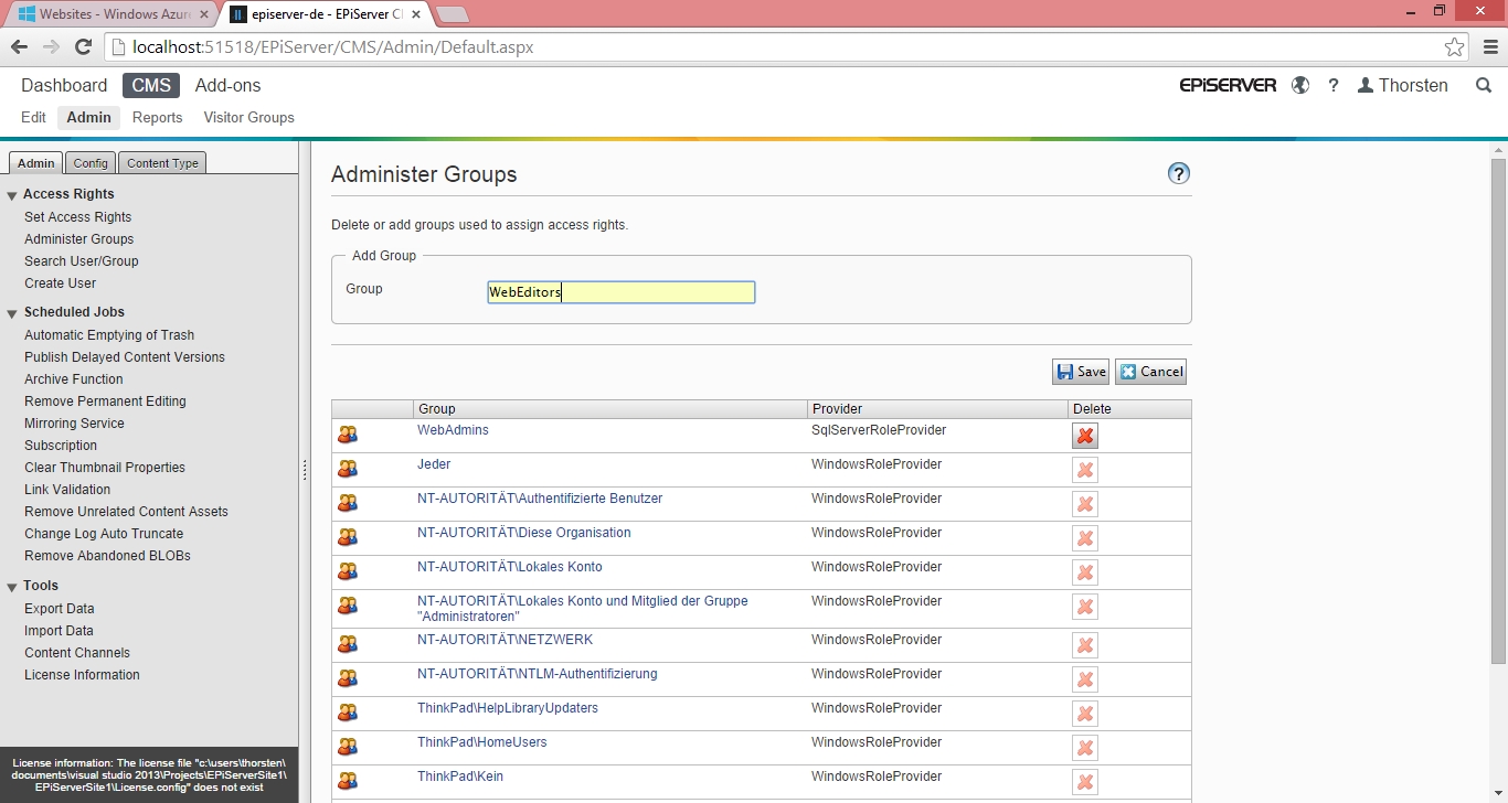 Bevor wir uns jedoch ins Backend auf der Azure-Website einloggen können, müssen wir in unserer lokalen Installation noch die zwei in der ‚web.config‘ bereits vordefininierten Gruppen ‚WebAdmins‘ und ‚WebEditors‘ sowie einen neuen Benutzer anlegen.