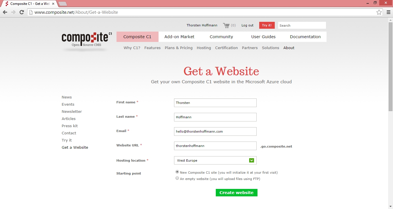 Auf der Website http://www.composite.net lässt sich eine solche, auf Microsoft Azure gehostete Website, über ‚Create Website – Run Composite C1 as a Service‘ starten: