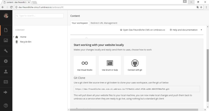 Neben unserem Live-Environment sehen wir im Backend die Option ‚Local‘, um lokal an der Website zu arbeiten. Auf die verschiedenen lokalen Entwicklungstechniken – Visual Studio, Web Matrix, Grunt, Gulp, Git, etc. – werde ich einem späteren Artikel eingehen: