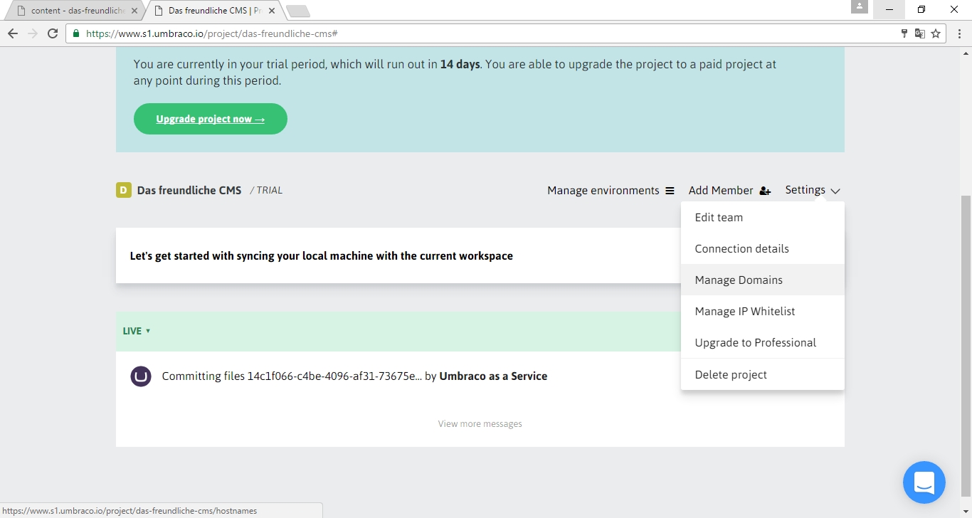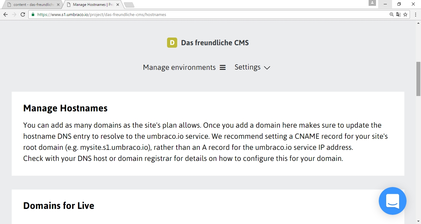 Da unsere Website natürlich auch unter unserer eigenen Domain erreichbar sein soll, müssen wir in den ‚Settings‘ die Einstellung ‚Manage Domains‘ wählen und unsere gewünschten Domains dort eintragen – vergleichbar der Hostname-Bindungen im IIS-Manager: