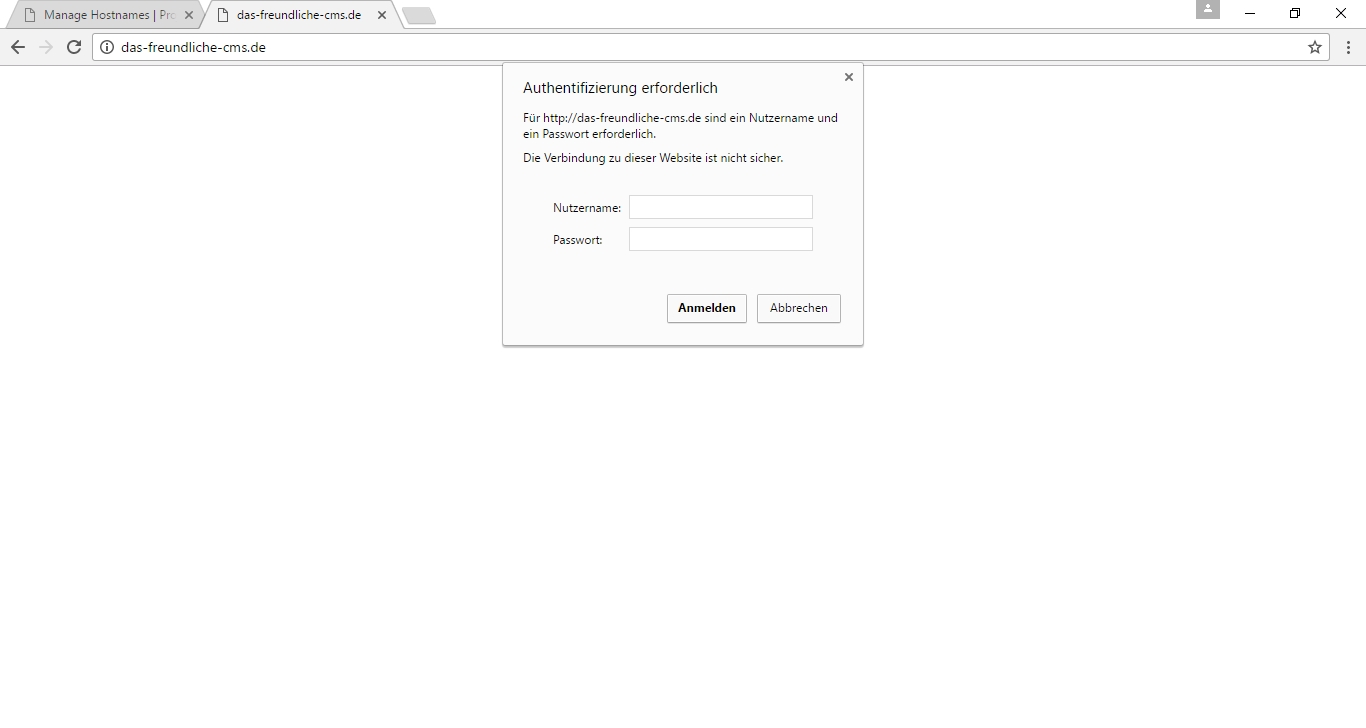 Nachdem die DNS-Änderungen durchgeführt wurden, können wir unsere Website also über unsere eigene Domain aufrufen – allerdings noch nicht öffentlich zugänglich, sondern aufgrund des Trial-Status durch Benutzername und Passwort geschützt: