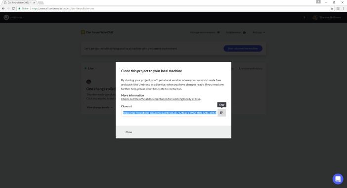 Um eine lokale Arbeitskopie unserer Website per Git zu klonen, loggen wir uns bei umbraco.io ein und kopieren uns die URL zu unserem Repository: