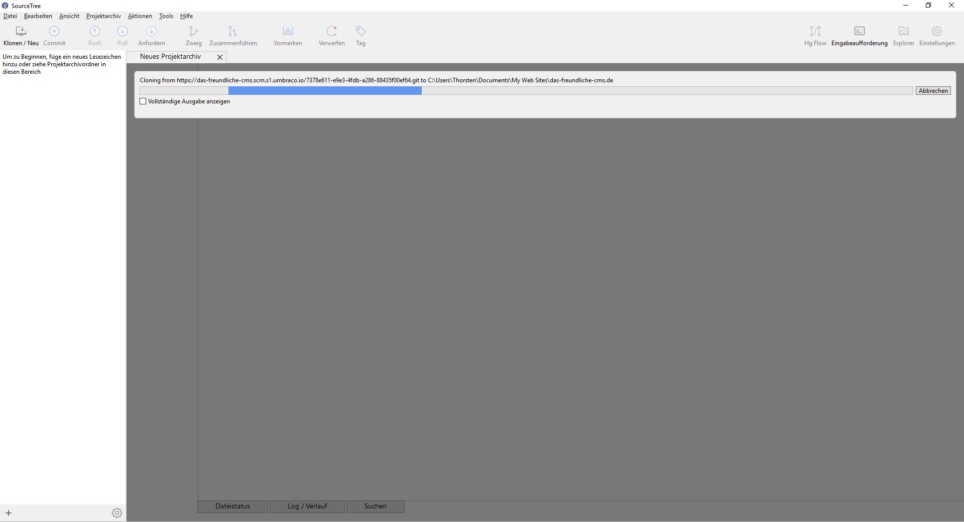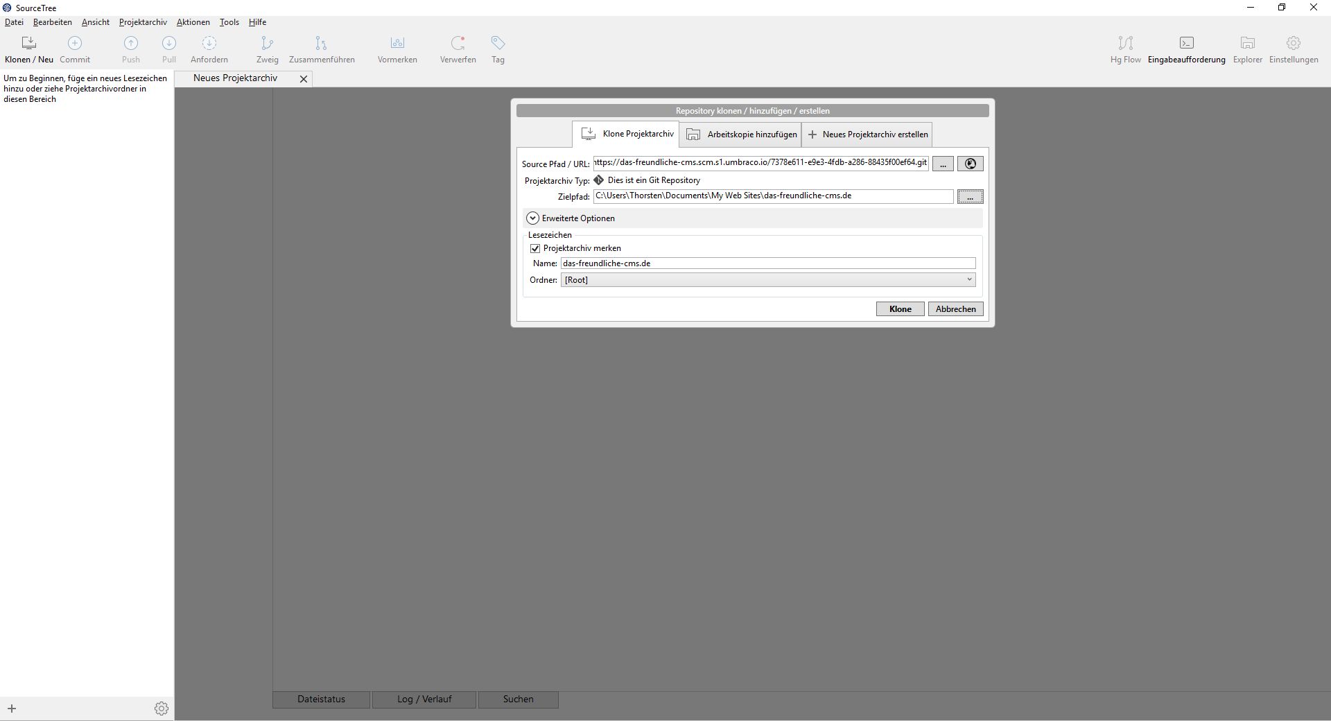 Anschließend erstellen wir mittels dieser URL und unseren Zugangsdaten eine lokale Kopie unserer Website – mit einem Git-Client wie z.B. SourceTree: