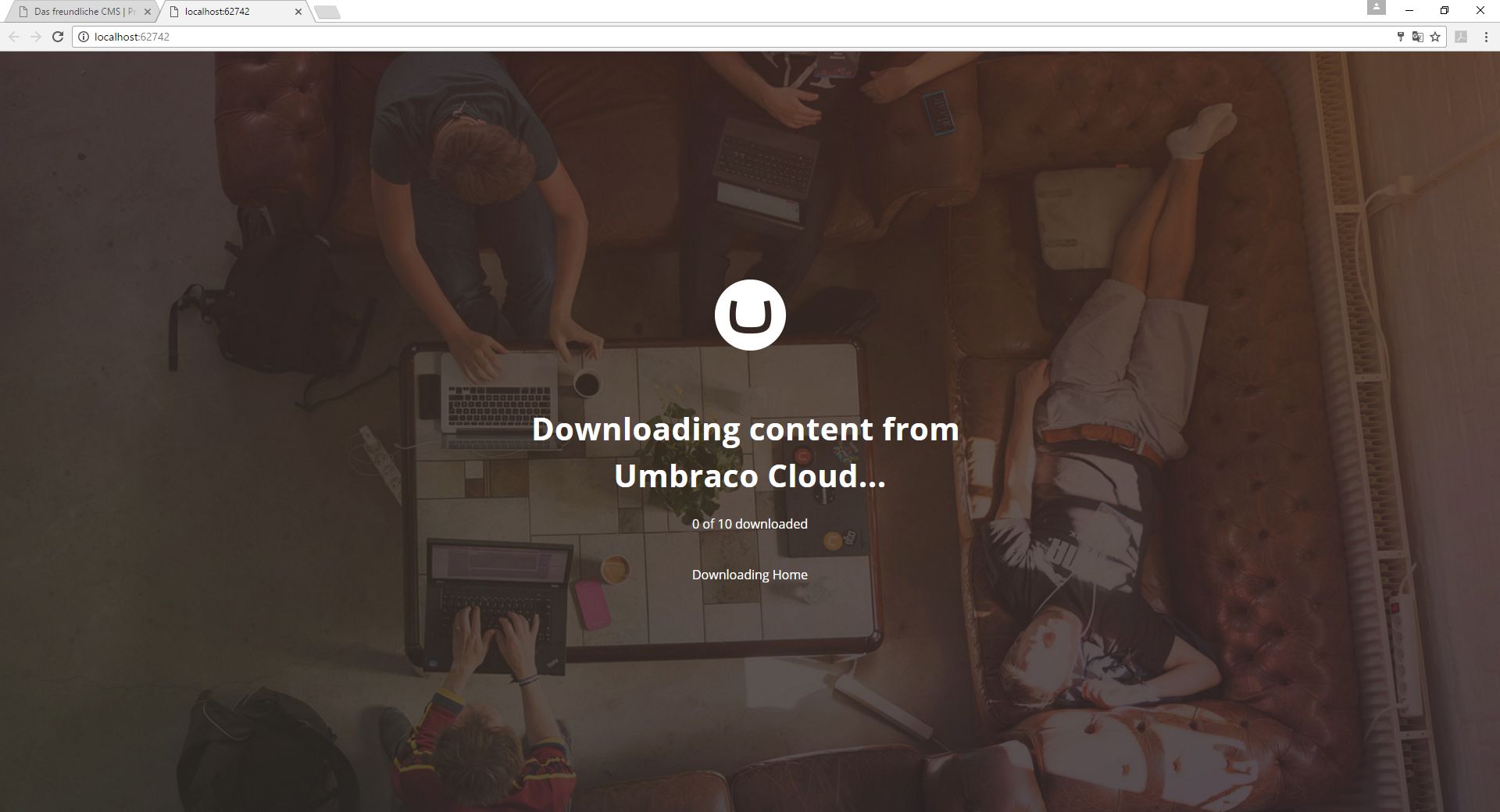Beim ersten Start der lokalen Website öffnet sich zunächst ein Assistent, der die Datenbankinhalte unserer produktiven Website herunterlädt bzw. mit unserer lokalen Kopie synchronisiert: