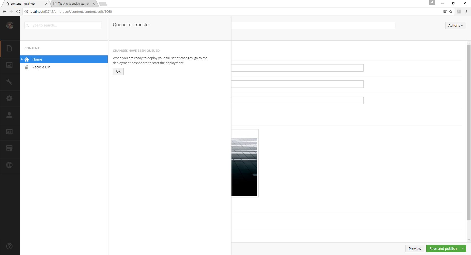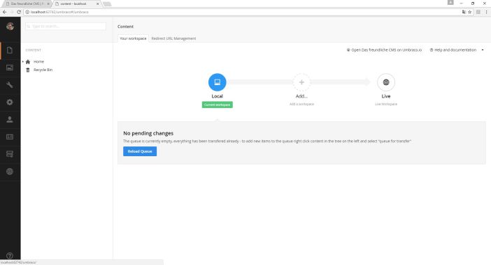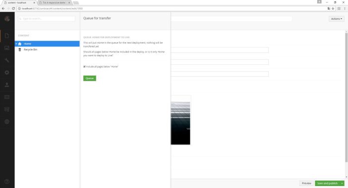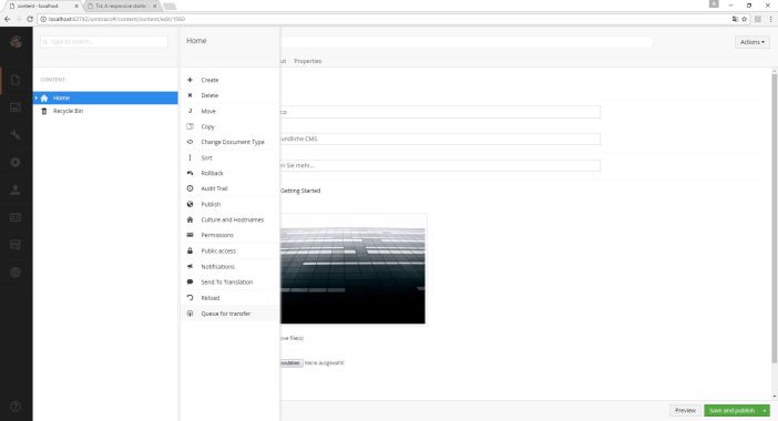 Um diese Änderungen nun in die Cloud zu deployen, öffnen wir das Kontextmenü unserer Startseite mit der rechten Maustaste und klicken auf ‚Queue for transfer‘. Jetzt sind unserer Änderungen in der Deployment-Warteschlange, deren Transfer in die Cloud wir im Dashboard starten können: