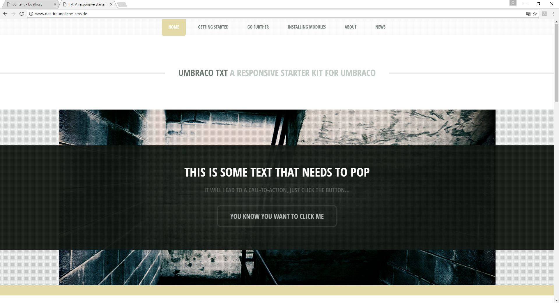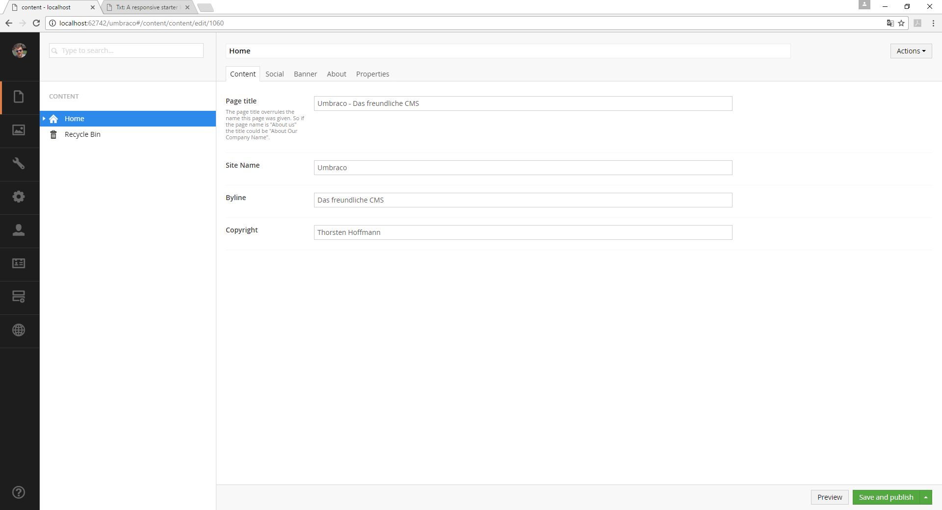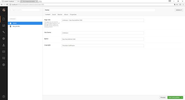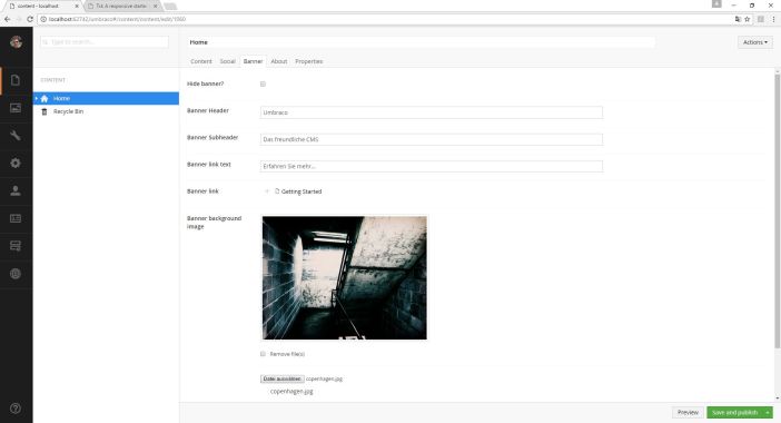 Jetzt können wir uns ins lokale Backend einloggen und mit dem Ändern von Inhalten beginnen. In diesem Beispiel ändern wir Page title, Site Name, Byline, Copyright sowie die Bannerinformationen und Hintergrundbild unserer Startseite: