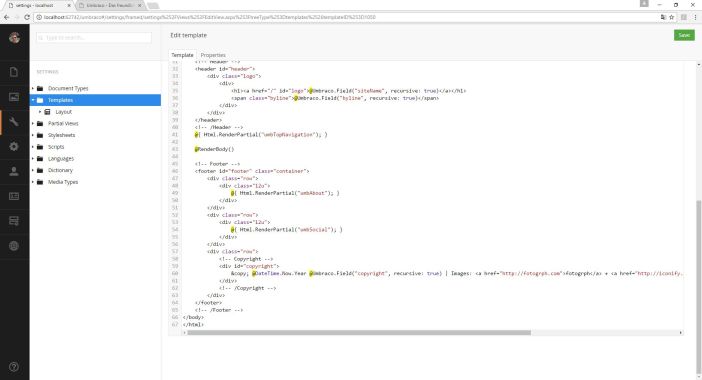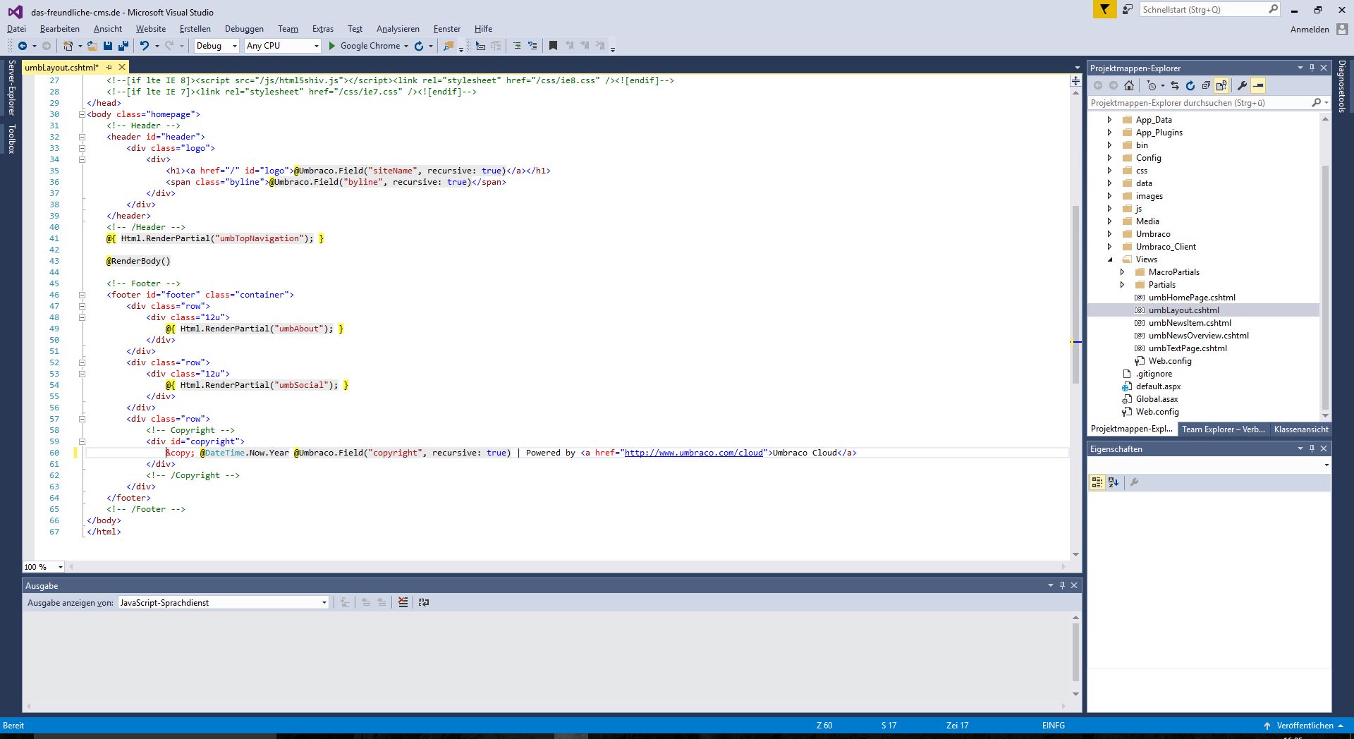 Als nächstes führen wir Änderungen am Template durch, um den Footer anzupassen und den Text ‚Powered by Umbraco Cloud‘ einzufügen: